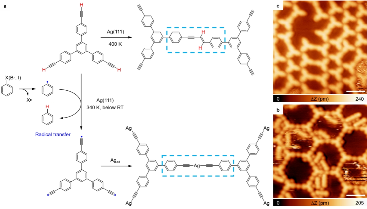 自由基是一类具有不成对电子的原子或基团,具有较高的化学活性,自由基反应也广泛的存在于各类反应中。然而在单分子尺度实现对自由基迁移反应的实空间直接观测一直是物理化学领域的难题。其原因是:1,实空间观测需将自由基前驱分子负载在金属表面,然而分子自由基在固体表面受导带电子的屏蔽效应和衬底的钉扎效应,其化学活性将大大降低。2,自由基是瞬态存在的,很难给出自由基迁移反应的证据。在此工作中,李青教授团队及其合作者利用超高真空扫描隧道显微镜、x光电子能谱以及程序升温质谱,结合第一性原理计算,阐明了苯自由基引发的分子间自由基迁移机制,并成功利用该机制实现了对芳基炔烃分子在Ag(111)表面上反应路径的精准调控,使其从无自由基辅助时的非脱氢偶合转变为有自由基时的高效高选择性脱氢偶联。偶联反应的温度从无自由基辅助时的400 K降至室温以下。作者通过一系列佐证实验揭示了自由基产生与转移反应的竞争与联系。此外,作者们还系统研究了分子间自由基迁移机制的普适性,发现其能够有效促进氨基和亚氨基等基团脱氢反应。该成果为表面精准合成提供重要的研究思路和理论基础。