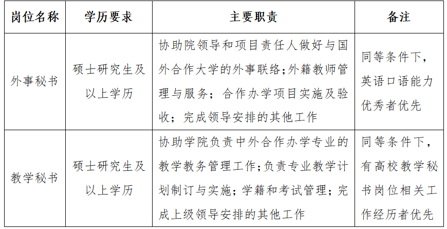 4.应聘教学秘书岗位,同等条件下具有高校教学秘书岗位相关工作经历者优先。