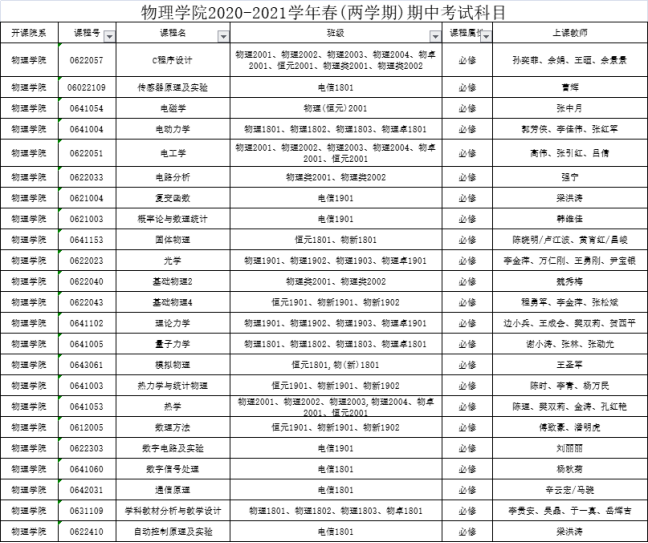 根据公司本科教学工作安排,各必修课以课程为单位自行组织期中考试,试卷及成绩于第十二周结束前交于公司备案,具体考试科目见下表。另外,公司继续落实全员听课制度,十七周以前,公司35岁以下青年教师听课4次,其余教师听课2次,听课记录于十八周内交公司检查备案。