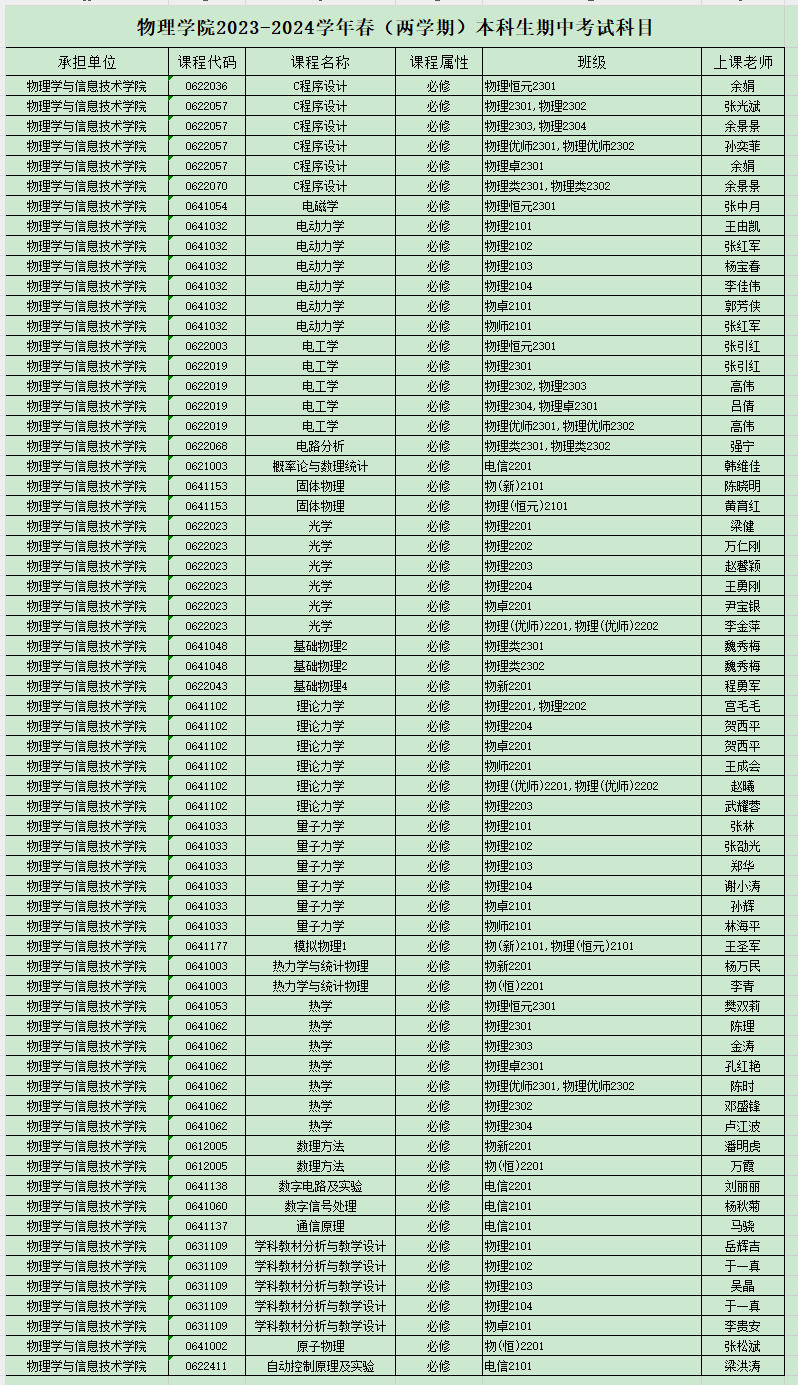 根据公司本科教学工作安排,各必修课以班级为单位自行组织期中考试,试卷及成绩于第十三周结束前交于公司备案,具体考试科目见下表。