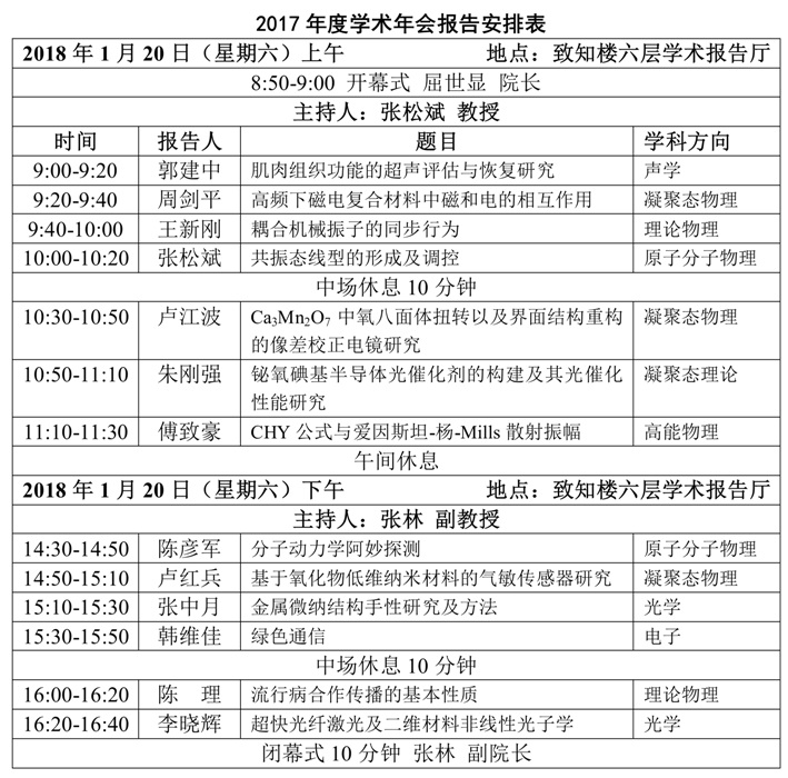 2017年在大家的共同努力下,公司团队建设工作、实验室建设和科学研究水平继续获得提升。2017年公司物理学专业学科评估为B档,进入全国前30%,大型精密测试仪器球差校正扫描透射电子显微镜调试安装完毕,2017年以第一单位发表论文共193篇,其中SCI论文143篇,一区论文8篇,二区论文48篇;全年项目立项总数为36项,科研总经费达1414万元,其中国家级项目14项,重大培育项目1项,国家重大仪器专项1项,科研经费1240万元。2017年度公司在材料物理、原子分子、凝聚态物理、声学、光学、电子信息等学科方向的相关领域取得了大量标志性的研究成果,其中在超声仪器研制、像差校正电镜研究、纳米光子学、超快激光分子动力学探测和操控、高频复合磁电材料、超快宽频光谱等方面获得了重要的研究进展。2017年公司通过12期的学术沙龙,对相关的研究成果进行了交流和讨论,为了进一步促进公司科学研究水平的发展,总结和交流公司2017年的工作进展,公司拟在2018年1月20日(星期六)举办全院学术年会,年会拟邀请公司在2017年做出突出成果的老师进行大会交流报告。根据公司决定,该项活动是公司一项重要的集体活动,欢迎大家积极参与和讨论。