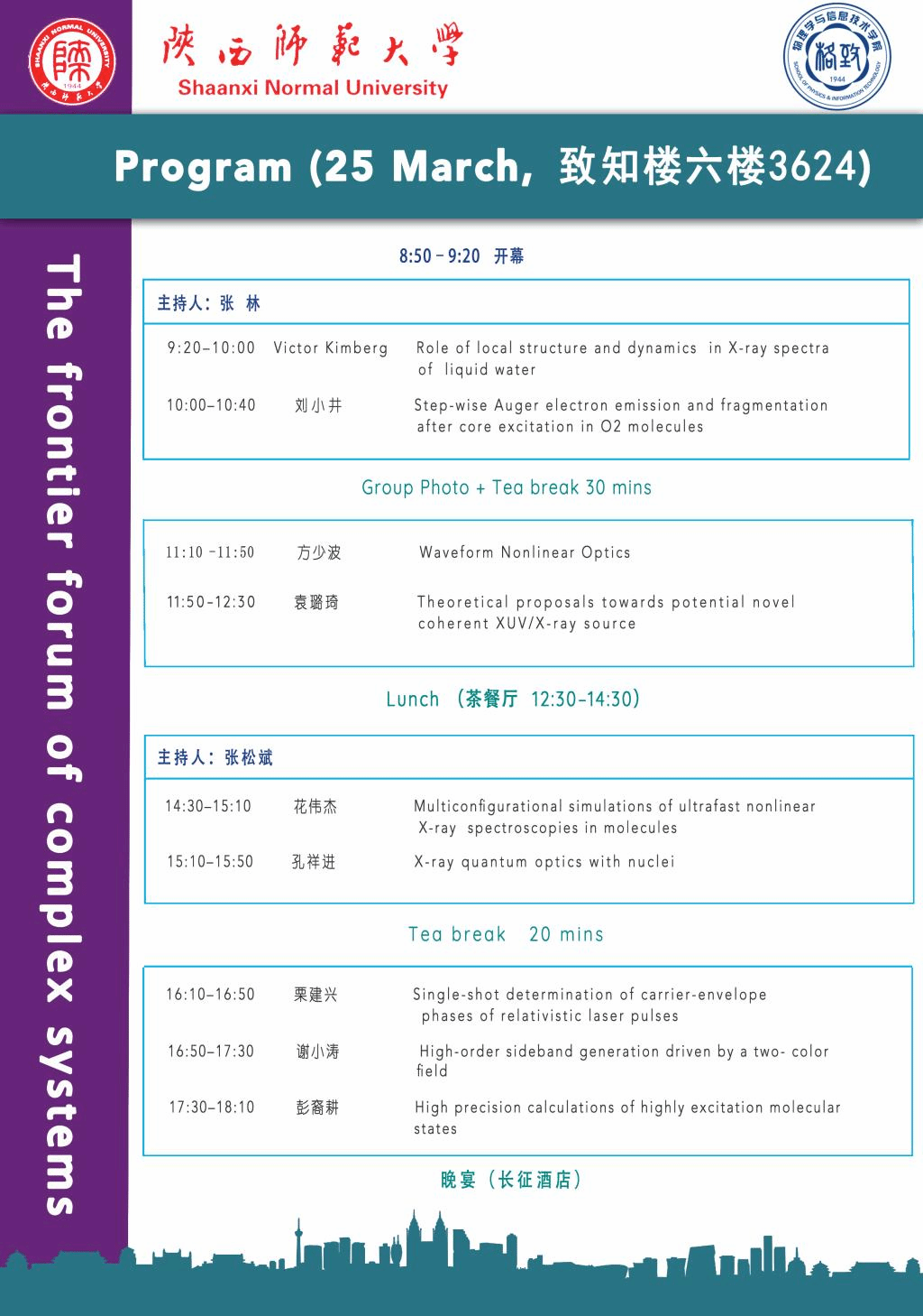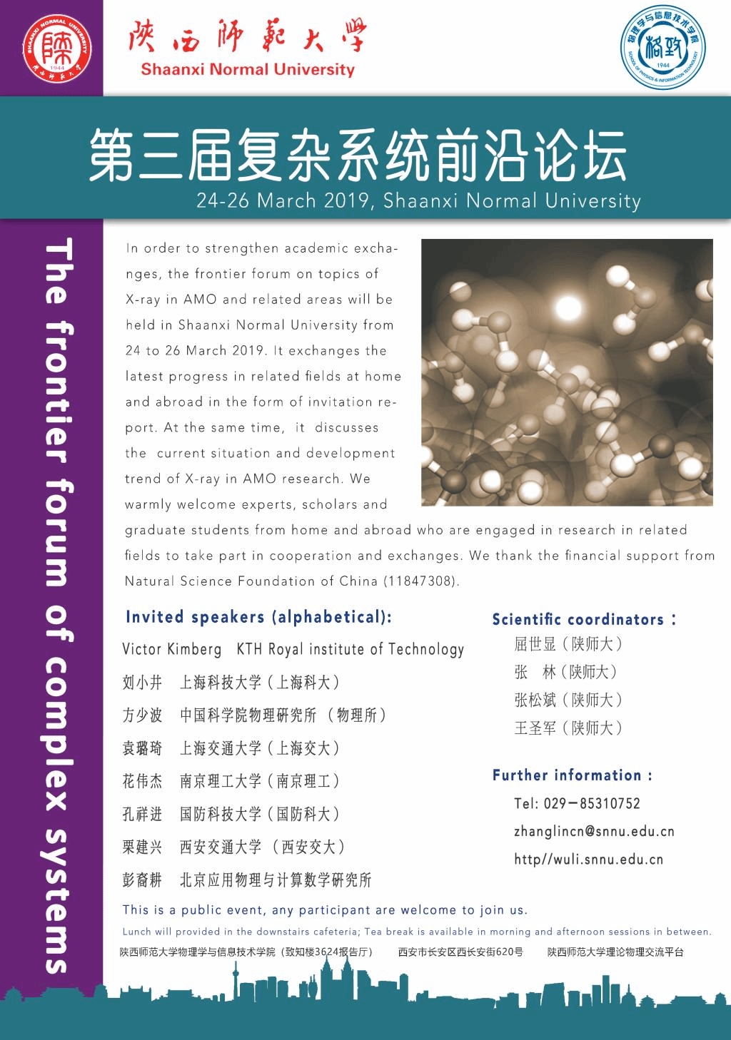 为加强国内外及中西部地区统计物理与复杂系统研究领域学者之间的学术交流,在国家基金委理论物理平台专项基金支持下,X-ray in AMO and related topics会议将于2019年03月24日至26日在365英国上市公司集团(陕西省西安市)举行。会议由365英国上市公司集团主办,会议以邀请报告的形式,交流国内外相关领域的最新进展,同时讨论X-ray in AMO研究的现状与发展趋势。热烈欢迎国内外从事相关领域研究的专家学者及研究生踊跃参加,合作交流!