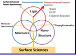 表面增强拉曼散射效应是分子、光与等离激元纳米结构作用的一种独特的光物理现象。自从该现象发现以来,已经基于这种效应发展出不同的光谱学方法,并且这些光谱学方法具有高的检测灵敏度,广泛用于化学、物理、生物、材料以及与日常生活相关的食品、安检、环保等领域。表面增强拉曼光谱可以从金、银、铜及过渡金属电极上检测吸附分子的拉曼光谱,为电极电解质界面提供分子在金属电极表面吸附、化学成键和化学反应信息。同时,当激光辐射到纳米结构电化学表面,纳米电极表面结构将远场光转化为近场光,将光能汇聚于表面局域区域,形成表面等离激元热点。当分子吸附在这些热点区域,不仅吸附分子的拉曼信号显著增强,而且由于产生热载流子,即热电子和热空穴,它们具有强的化学反应,驱动化学反应。以对巯基苯胺作为模型体系,对该分子的SPR增强化学反应进行了系统的研究。