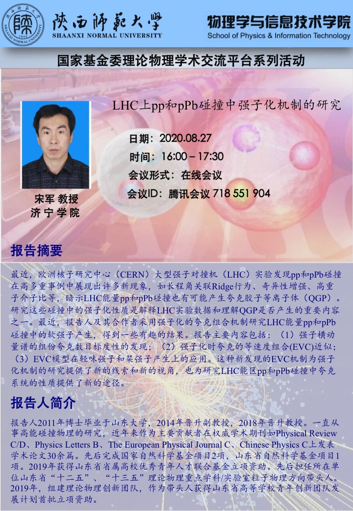 国家基金委理论物理学术交流平台系列活动:LHC上pp和pPb碰撞中强子化机制的研究