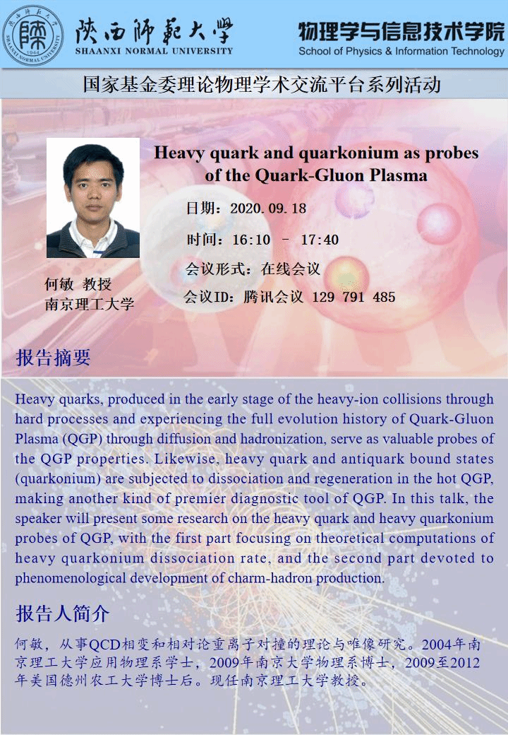 国家基金委理论物理学术交流平台系列活动:Heavy quark and quarkonium as probes of the Quark-Gluon Plasma