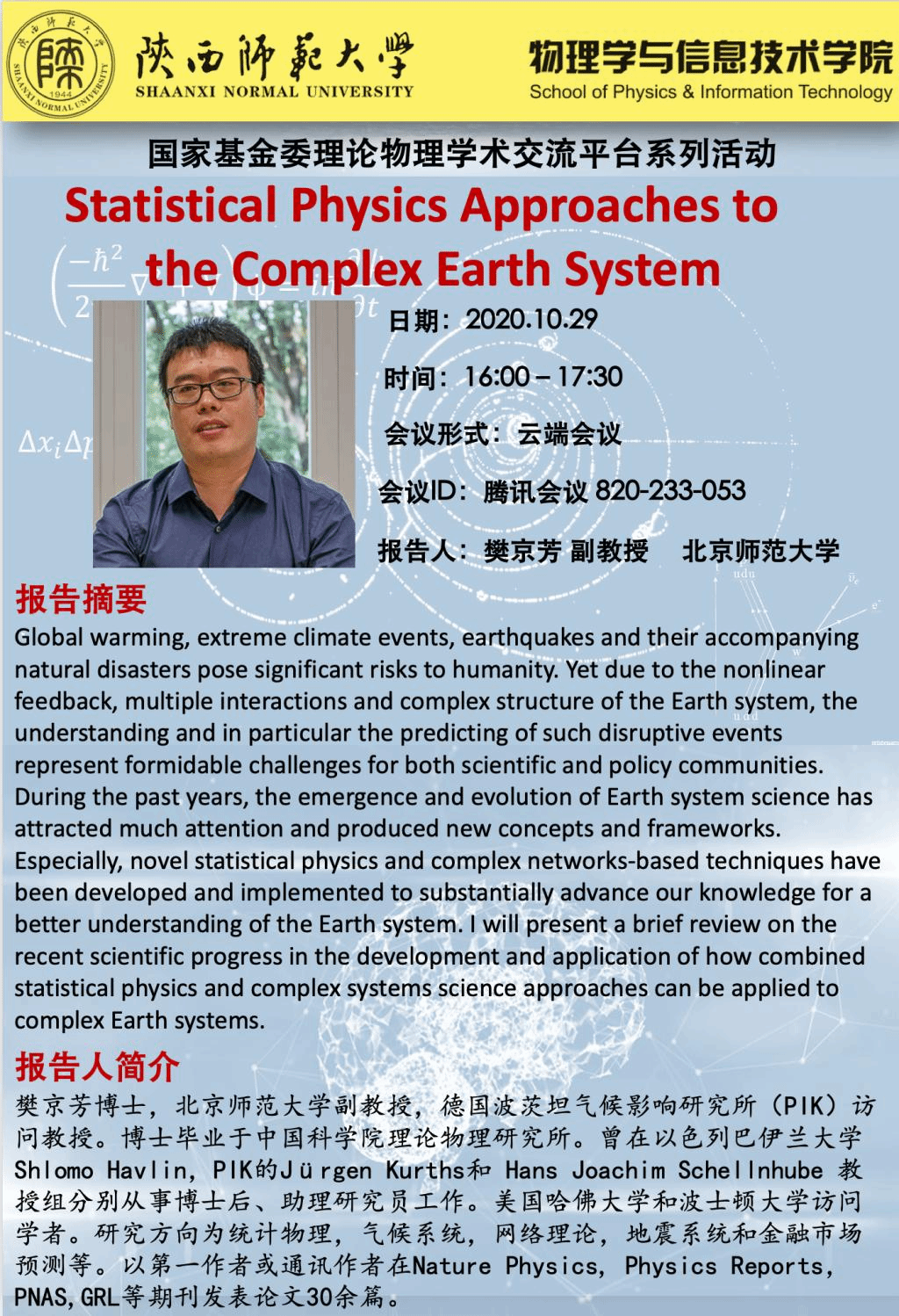国家基金委理论物理学术交流平台系列活动:Statistical Physics Approaches to the Complex Earth System