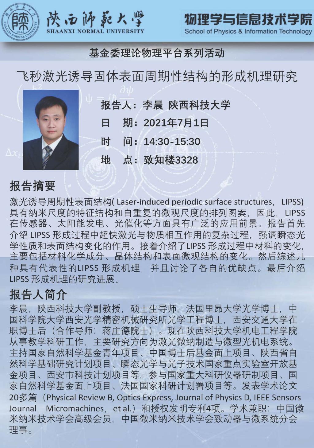 基金委理论物理平台系列活动:飞秒激光诱导固体表面周期性结构的形成机理研究