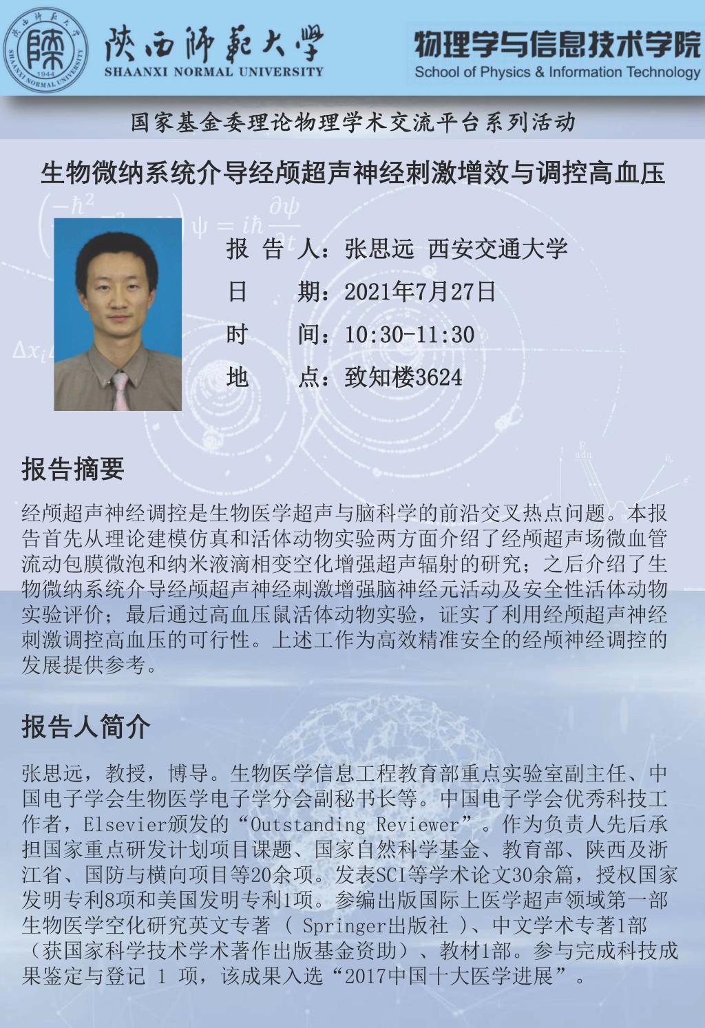 基金委理论物理平台系列活动:生物微纳系统介导经颅超声神经刺激增效与调控高血压