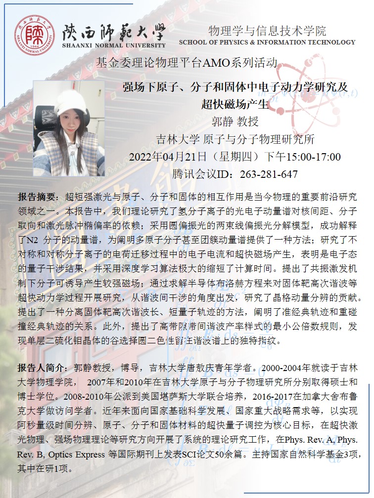 基金委理论物理平台AMO系列活动:强场下原子、分子和固体中电子动力学研究及超快磁场产生