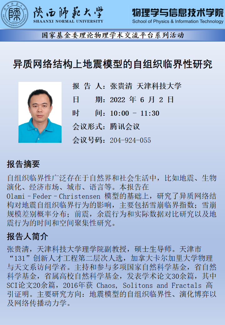 基金委理论物理平台系列活动:异质网络结构上地震模型的自组织临界性研究